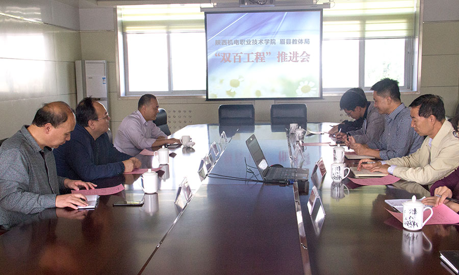 2017年9月29日下午两点半,在行政楼西会议室召开了陕西机电职业技术学院、眉县教体局"双百工程"工作推进会。眉县职教中心副校长蒋亚杰、教务科长朱小强、招生就业科长翟枭,我院党委委员、副院长张新堂、工会主席张湛、团委书记李明、教务部部长王建斌、招办副主任满春燕等出席本次会议。