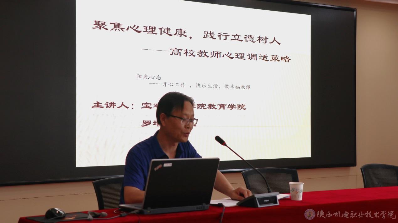 根据学校本年度教师素养提升计划,为促进我校教师的心理健康,以阳光的心态管理情绪应对压力,开心工作,快乐生活,做幸福教师,教师发展中心于6月23日下午,邀请宝鸡文理学院教育科学研究所副所长、陕西省心理学会理事、宝鸡市心理学会会长罗增让教授在宝福路校区汽车机电大楼会议室为全校教职工作题为《聚焦心理健康践行立德树人——高校教师心理健康调适策略》的心理健康知识讲座。