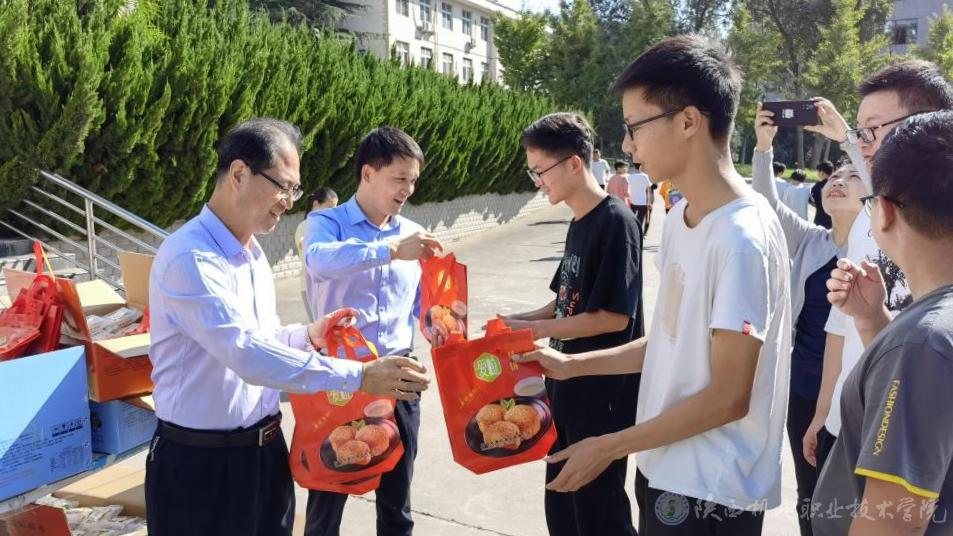 又是一年中秋月,送汝月饼满院香。9月21日上午,党委书记伊逊智、党委副书记邓新治、院长助理赵争东、学生处负责人、各二级学院支部书记及学生科科长等为留校的学生发放月饼,团委老师前往十四运我校志愿者驻地慰问学生,带去学校对莘莘学子的节日问候和祝福。