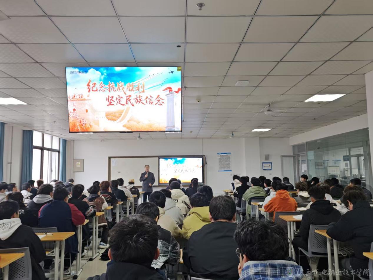 10月23日下午,陕西机电职业技术学院党委书记伊逊智在宝福路校区汽车机电大楼403教室为25智联汽车1、25智联汽车2合班学生讲授形势与政策课《纪念抗战胜利坚定民族信念》专题内容。