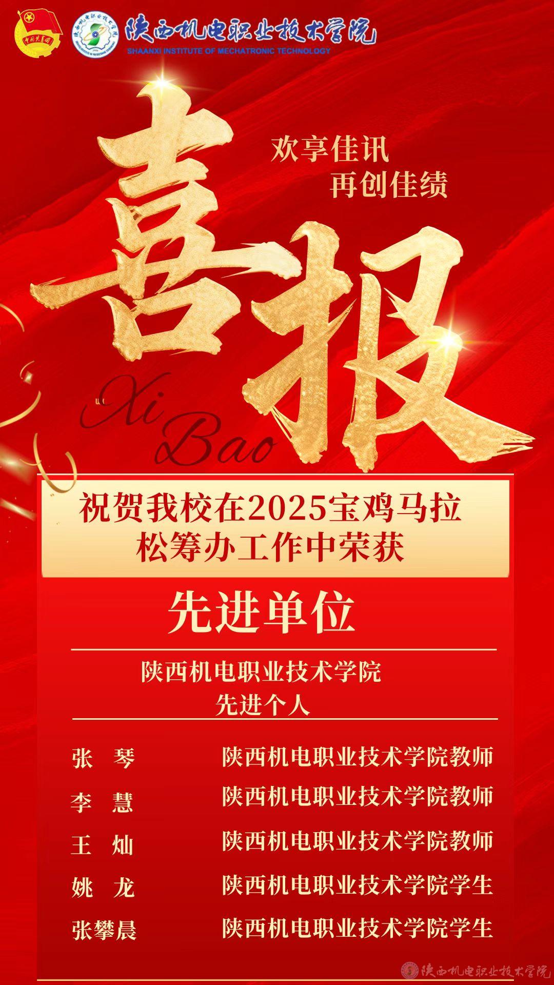 近日,宝鸡马拉松赛组织委员会发布的文件《关于表扬 2025 宝鸡马拉松筹办工作先进的通报》中,陕西机电职业技术学院荣获“先进单位”;教师:张琴、李慧、王灿;学生:姚龙、张攀晨荣获“先进个人”。在赛事筹办过程中,各位老师与同学恪尽职守、无私奉献,凭借饱满的热情、务实的作风投入到各项工作中,在志愿服务、后勤保障等相关岗位上攻坚克难、履职尽责,用实际行动诠释了新时代教育工作者与青年学子的使命担当,得到了组委会及社会各界的高度认可。