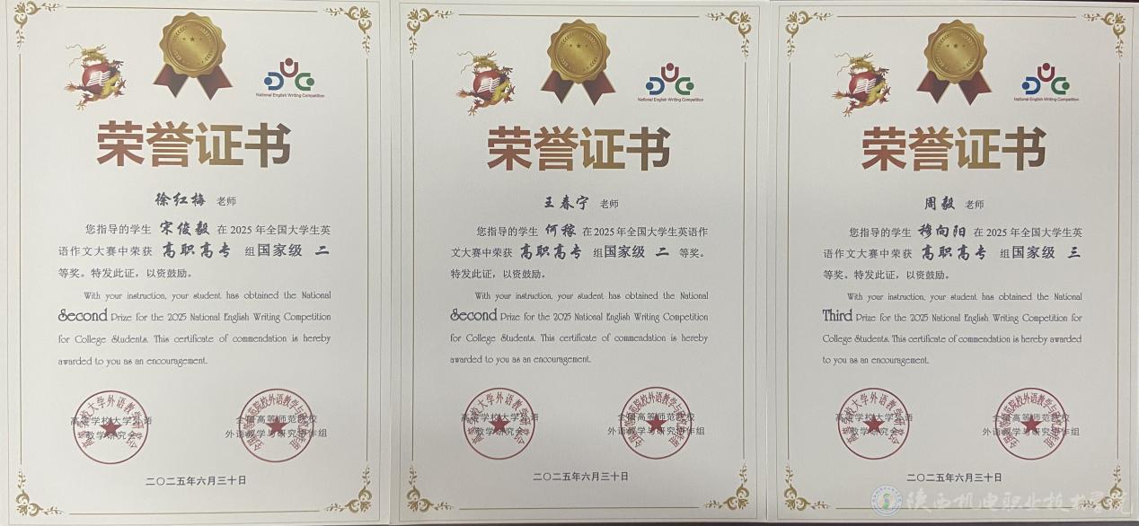 近日,由高等学校大学外语教学研究会、全国高等师范院校外语教学与研究协作组联合主办的2025年全国大学生英语作文大赛获奖名单正式揭晓。陕西机电职业技术学院学子在此次大赛中表现优异,共斩获国家级奖项4项、省级奖项30项,其中,国家级二等奖2项、三等奖2项,省级一等奖12项、二等奖11项、三等奖7项,获奖总数与层级均创历史新高。