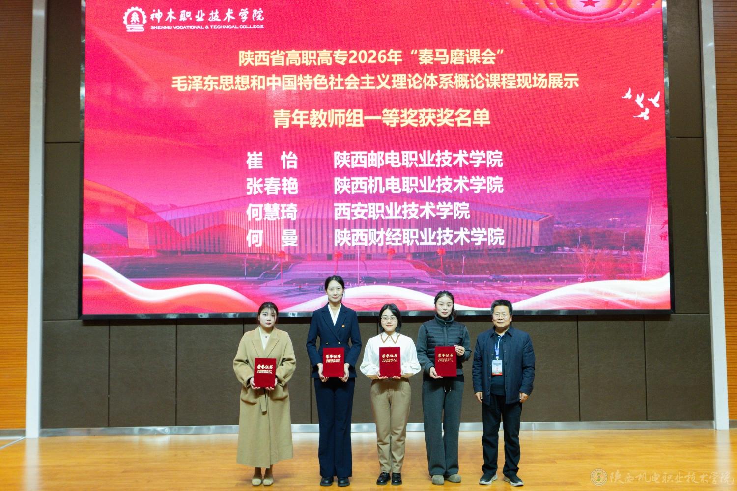 为深入贯彻习近平总书记在学校思想政治理论课教师座谈会上的重要讲话精神,落实习近平总书记对学校思政课建设作出的重要指示精神,3月20日,陕西高职高专2026年“秦马磨课会”毛泽东思想和中国特色社会主义理论体系概论课程现场教学展示在神木职业技术学院举行。陕西机电职业技术学院思政课教师张春艳在现场展示环节荣获“青年教师组”一等奖。我校马克思主义学院负责人王康、青年教师代表屈婉蓉参加此次活动。